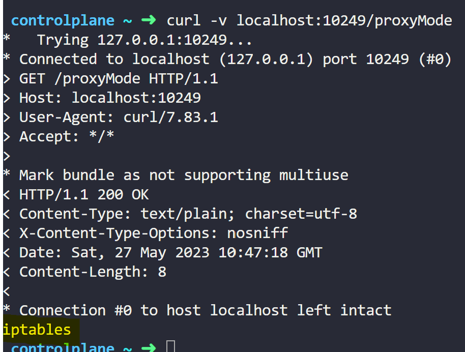 curl -v localhost:10249/proxyModeRunning the command gives the following output: