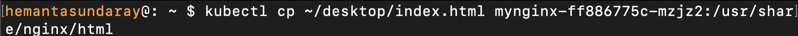kubectl cp ~/desktop/index.html mynginx-ff886775c:/usr/share/nginx/htmlNotice that we have changed the order of the source and destination paths in this command.
