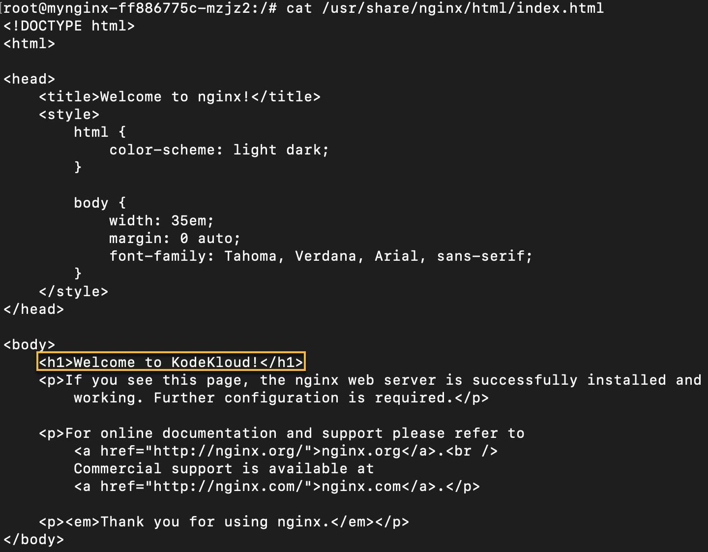 cat /usr/share/nginx/html/index.htmlThis will display the contents of the file in the shell. You should see the modified welcome message, as highlighted below: