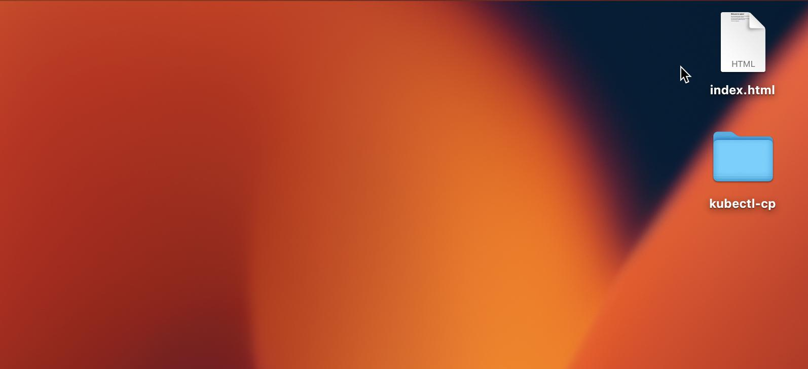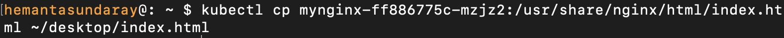 kubectl cp mynginx-ff886775c:/usr/share/nginx/html/index.html ~/desktop/index.htmlDon’t forget to replace mynginx-ff886775c with the name of your Pod.