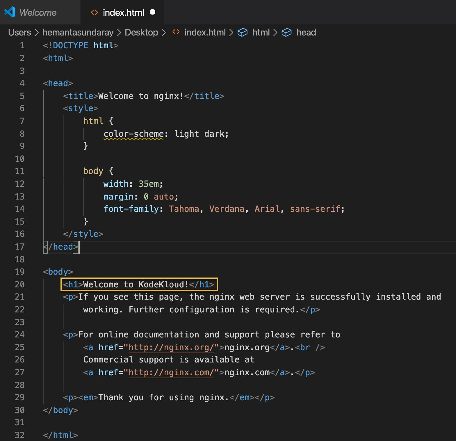 To get started, open the index.html file in your preferred code editor and make the desired modifications to the HTML markup. Below, I have changed the welcome message within <h1> tags from Welcome to nginx! to Welcome to KodeKloud!. You can make any other changes you prefer.