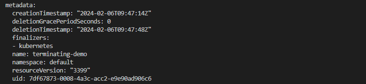 kubectl get pod/finalizer-demo -o yamlYou should see this in the metadata section: