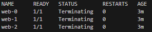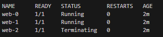 kubectl delete statefulset webIf you run the kubectl get pods command, you will see something like this: