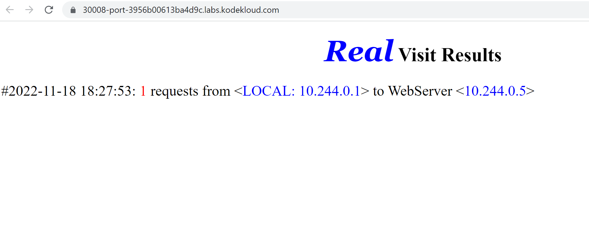 <!DOCTYPE html> <html> <body><center><h1><font color="blue" face="Georgia, Arial" size=8><em>Real</em></font> Visit Results</h1></center><p style="font-size:150%" >#2022-11-18 18:27:08: <font color="red">2</font> requests from <<font color="blue">LOCAL: 10.244.0.1</font>> to WebServer <<font color="blue">10.244.0.6</font>></p></body> </html>