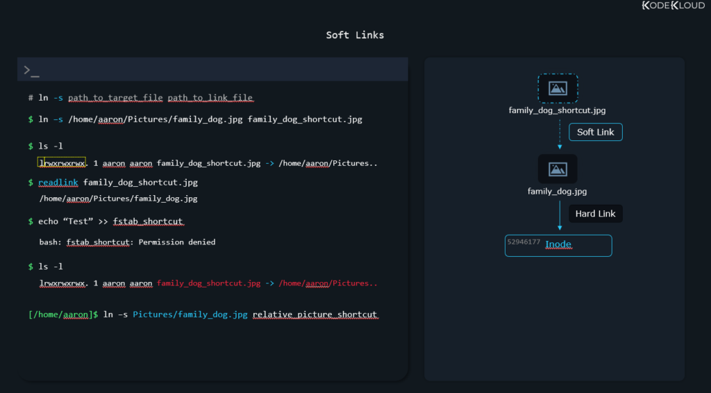 ln -s /home/alex/Pictures/family_dog.jpg absolute_shortcutIf we ever change the directory name “alex” in the future, to something else, this soft link will break.