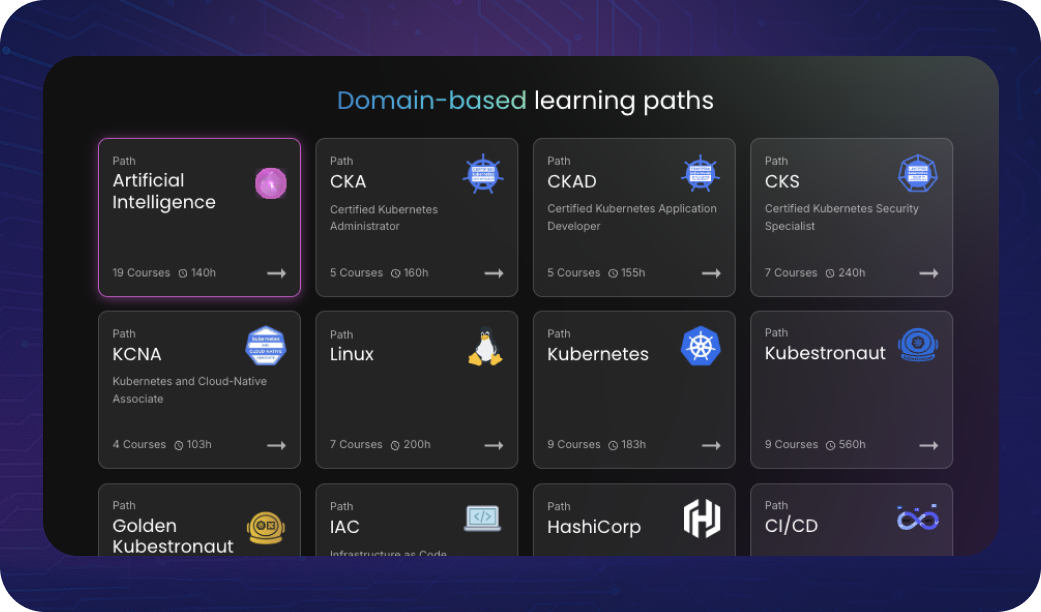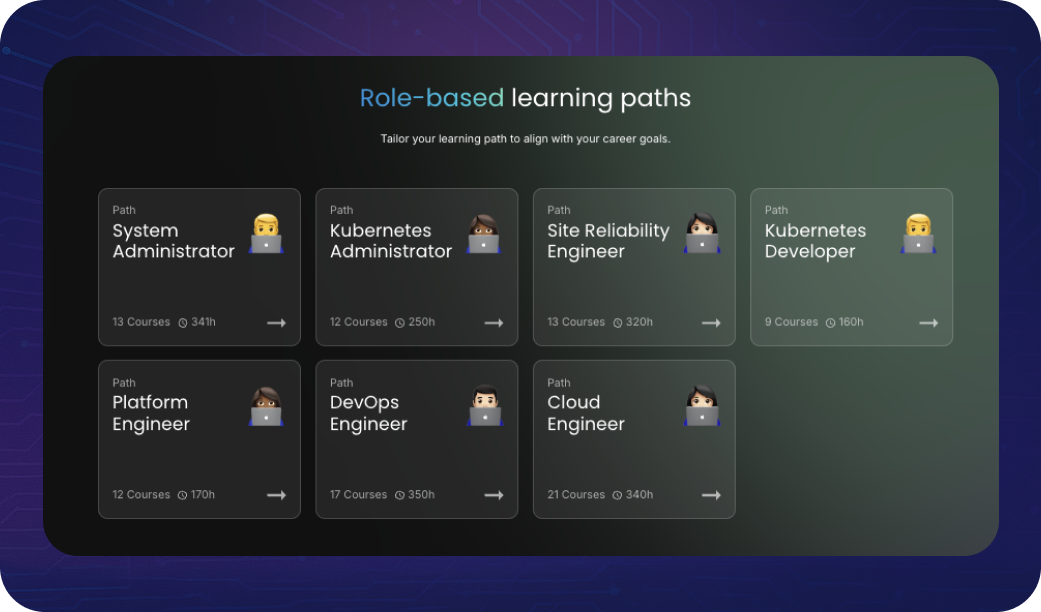 KodeKloud provides curated learning paths spanning DevOps, Cloud (AWS, Azure, GCP), Kubernetes (from KCNA to CKA/CKAD and beyond), Infrastructure-as-Code, Automation, and even AI/ML fundamentals. These paths are designed to take learners from foundational concepts to advanced, real-world proficiency. For example, the Kubestronaut learning path covers the core Kubernetes certifications (CKA, CKAD, CKS, etc.), while the Golden Kubestronaut program goes further guiding professionals to master all CNCF Kubernetes certifications (and related tech like service mesh, CI/CD, and observability). These programs have created a community of Kubernetes experts recognized by the industry. Similarly, role-based paths (e.g. for Site Reliability Engineer, Platform Engineer, DevOps Engineer) ensure that training aligns with the team’s actual job roles. This role-focused, continuous learning approach helps enterprises build skills in a targeted way, whether you need your ops team to learn SRE practices or your developers to pick up Terraform and cloud security.