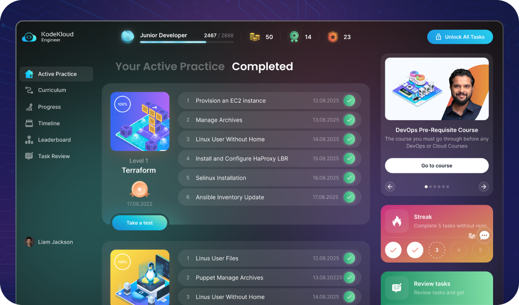 KodeKloud Engineer takes hands-on learning to the next level by simulating real project tasks on real systems. Learners join a virtual organization, receive daily scenario-based tasks mirroring production incidents, and solve challenges across Linux administration, Kubernetes troubleshooting, AWS/Azure/GCP operations, CI/CD pipeline debugging, and Infrastructure as Code.