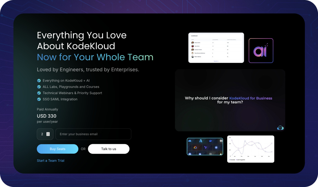 For organizations and CXOs, KodeKloud offers enterprise features that make managing team skilling at scale straightforward. The KodeKloud Business plan provides an enterprise dashboard for tracking team progress and learning metrics, SSO/SAML integration for easy user management, centralized billing, and even the ability to assign seats or transfer licenses as team membership changes due to valid reasons. There’s also the KodeKloud Team Trial option and dedicated account support meaning you can pilot the platform with your team and get guidance on the best learning plans. Additionally, KodeKloud’s content stays up-to-date with the fast-changing tech landscape (with new courses on technologies like ArgoCD, Backstage, Cilium, policy-as-code, etc. in development. This ensures your talent is learning the latest and greatest practices, from GitOps to agentic AI tools. By partnering with KodeKloud, enterprises essentially gain a one-stop skilling solution covering the full stack of competencies needed for cloud, DevOps, and AI excellence. It’s a platform built by experts (and CNCF ambassadors, Golden Kubestronauts) who deeply understand cloud-native tech and how adults learn best through hands-on immersion and real-world projects.