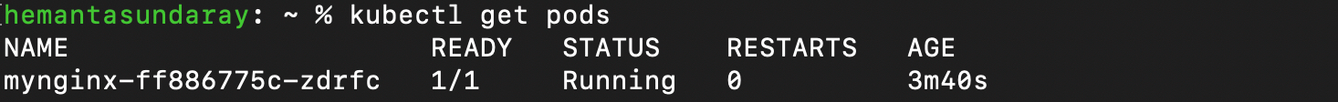 We can see that the deployment named "mynginx" has been deployed successfully and is now running. Now, let's make sure that the Pod created by the deployment is running too. To check this, run the following command: