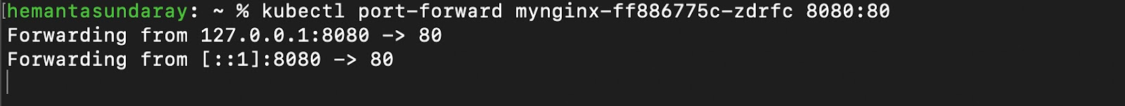 kubectl port-forward <INSERT_POD_NAME> 8080:80After running the command, you’ll see an output similar to the following: