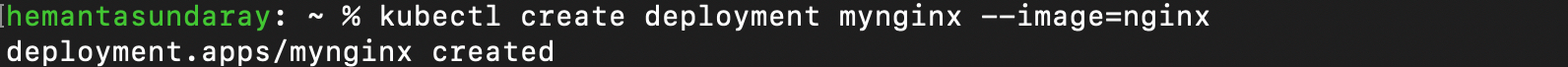kubectl create deployment mynginx --image=nginxHere, "mynginx" is the name of the deployment. You can choose any name you like for your deployment. And "--image=nginx" is the name of the Docker image (in this case, "nginx") used to create the container that will run in the Pod you'll be connecting to.