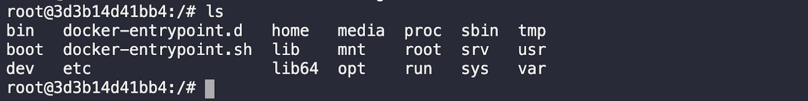 The output (root@3d3b14d41bb4:/#) that you see is the command prompt of the Bash shell session. You can now execute commands inside the container.