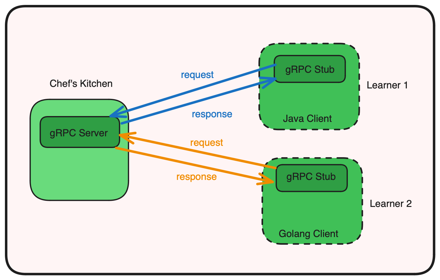 - The Magical Phone (gRPC): This is where gRPC comes in, acting as the phone line between the Learner and the Chef. It's not just any phone; it's a special one that can transmit tastes, smells, and cooking techniques instantly.