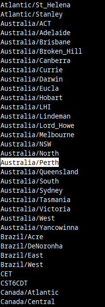 Perth, not perth, as searches in Linux are case sensitive. Looking for perth, with a lowercase p would return zero results.If, for some reason, you cannot find the correct city in that map, then you can simply google something like "australia timezones," or whatever area you live in. You'll get a list like this: