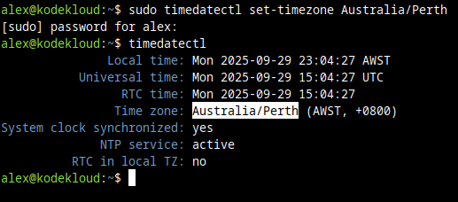 sudo timedatectl set-timezone Australia/PerthNext, check if the timezone has been changed correctly: