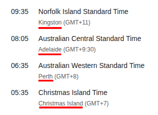 Australia. From the previous examples you'd expect something likeAustralia/Christmashere, since that island belongs to them. But no, the timezone is labeled under Indian Ocean, not Australia. So it'sIndian/Christmasinstead ofAustralia/Christmas.
