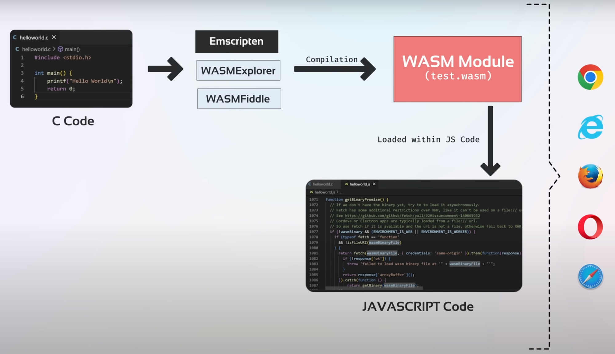 WebAssembly is a new type of compilation target for languages such as C, C++, and Rust, which is used to run native apps inside web browsers. To create a WebAssembly binary file (.wasm), the native code is compiled using an online assembler such as WASMExplorer or WASMFiddle or a tool like Emscripten.