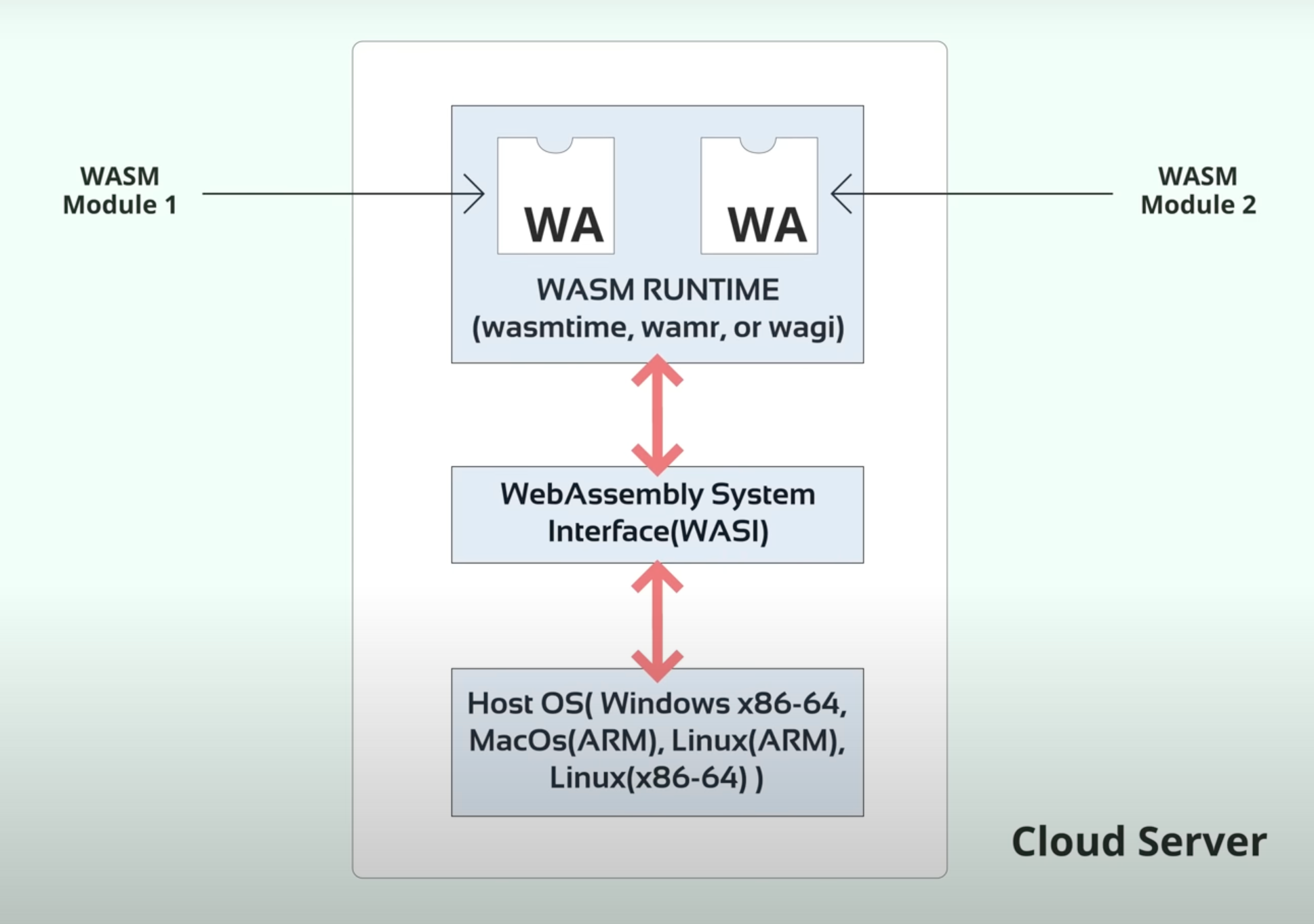 The operating system and the WebAssembly System Interface, which helps the WASM runtime access system resources, work together to allow the WebAssembly binaries to run on top of them.