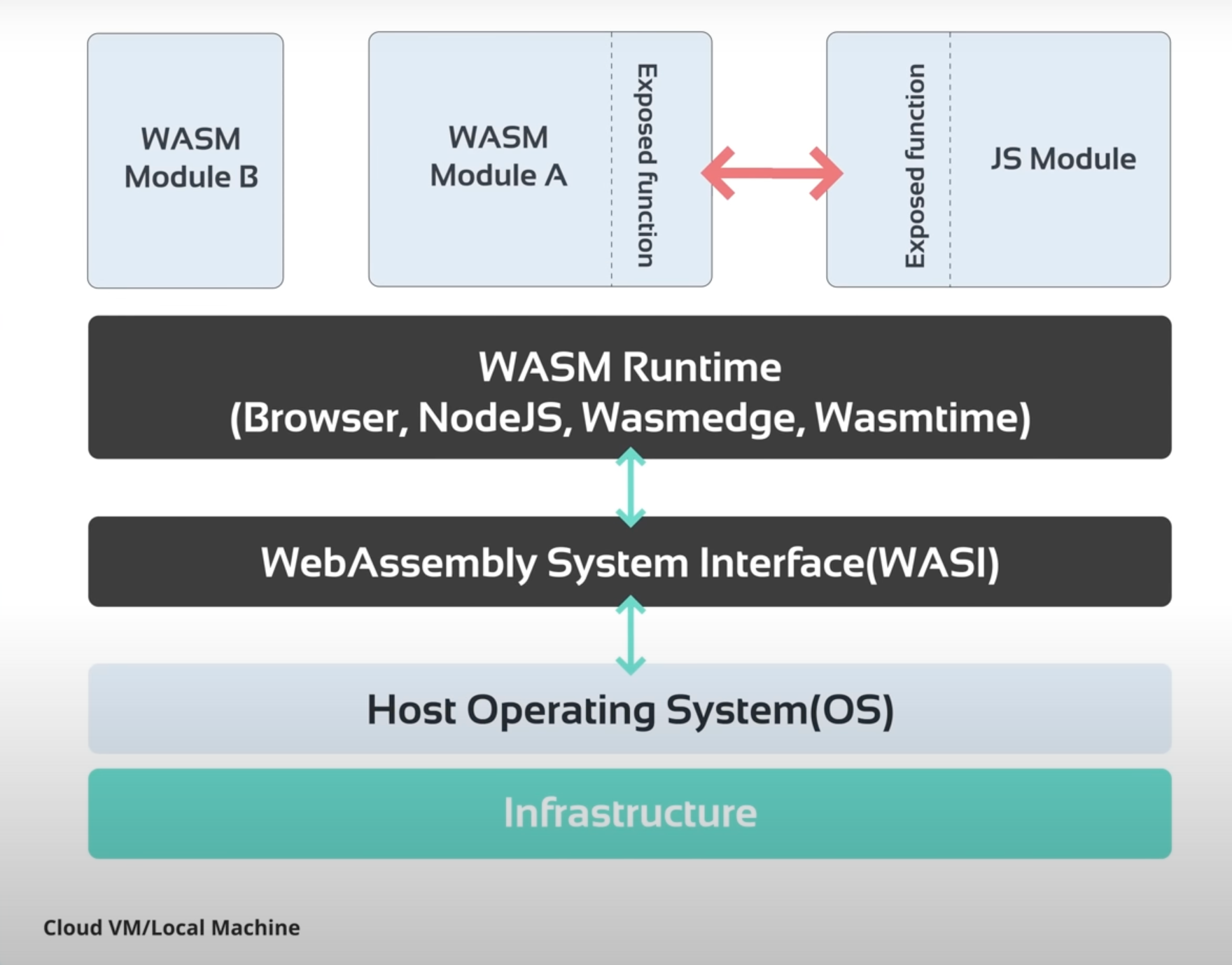 Looking at the WebAssembly (WASM) architecture diagram, you'll see a hierarchy similar to Docker's. It starts with the infrastructure, followed by the host operating system, and then the WebAssembly System Interface(WASI), which provides access to system resources for the WASM runtime. Finally, the 'WASM' runtime runs the WASM modules.