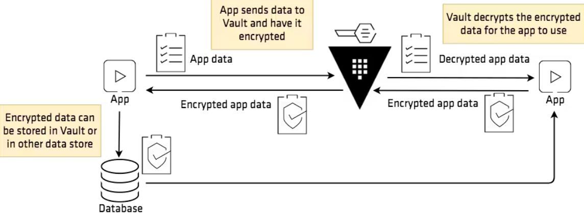 - Transit Secrets Engine - Vault uses a transit secrets engine to enhance the security of your data during transmission. This service allows security teams to encrypt data, which adds layer of protection against intrusions. To use it, an app requests Vault to encrypt the data before transmission. See the graphical representation below: