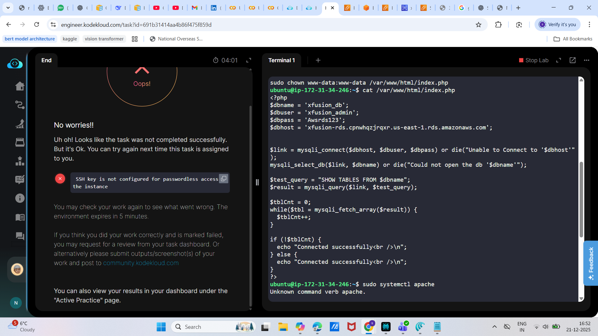 i was able to perform password less authentication and managing the RDS but still facing task failed issue
