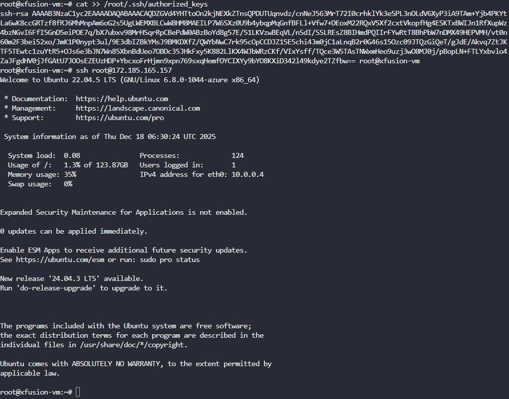 The Nautilus DevOps team is working on setting up secure SSH access for their virtual machines in Azure. One of the requirements is to add the SSH public key of the root user from the Azure client host (landing host) to the `datacenter-vm` Azure VM's `authorized_keys` file. This ensures secure and password-less SSH access to the VM.