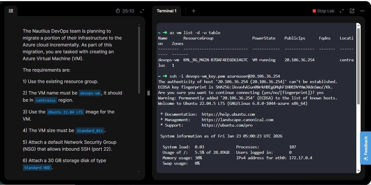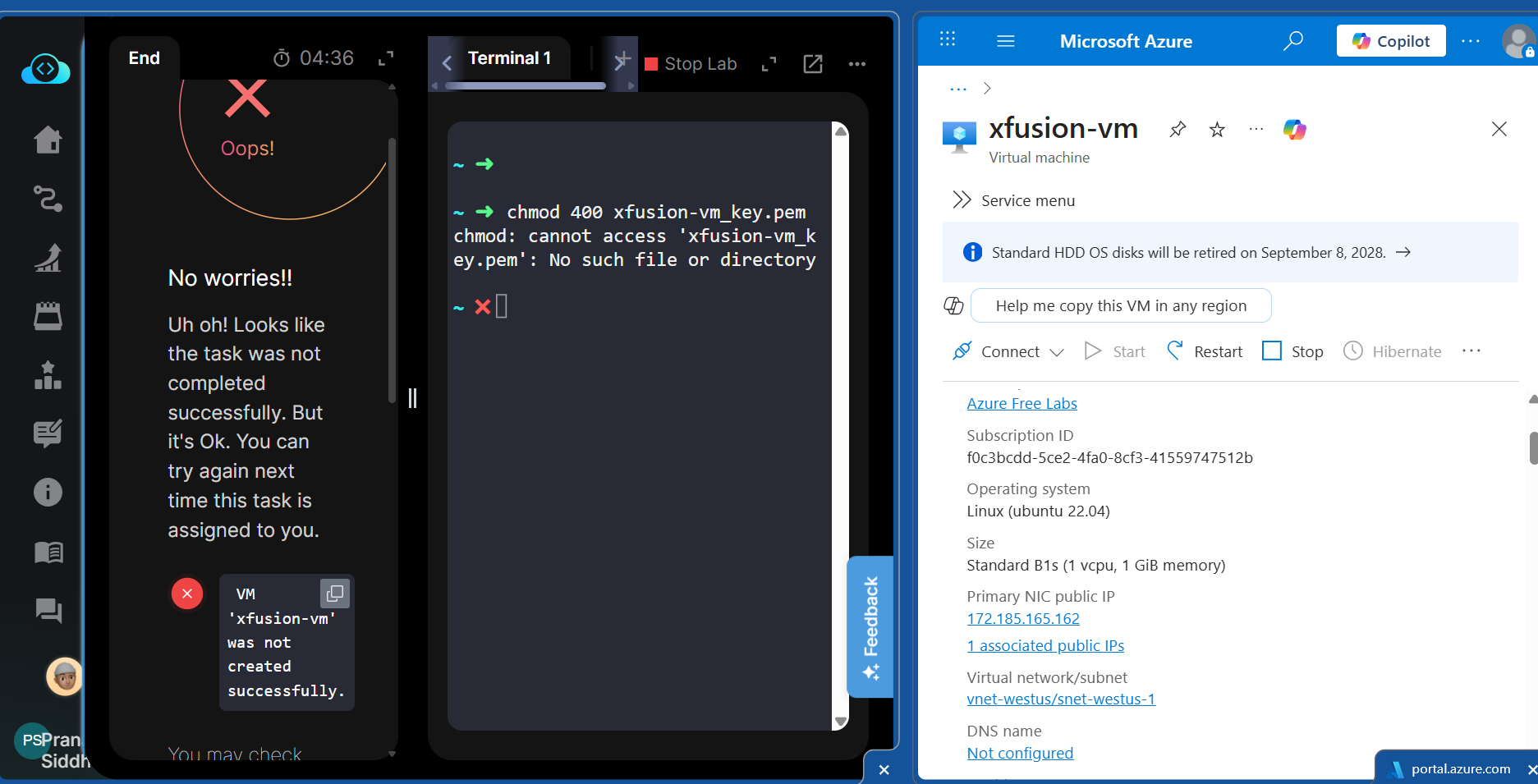 I have attached screenshot of the created resource which was mentioned. I have also attached the terminal screenshot showing i was able to ssh into the newly created virtual machine but still my task was shown as failed and my streak ended. Please check and restore my streak as well as mark the task completed.