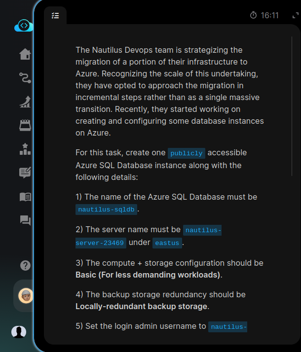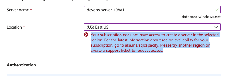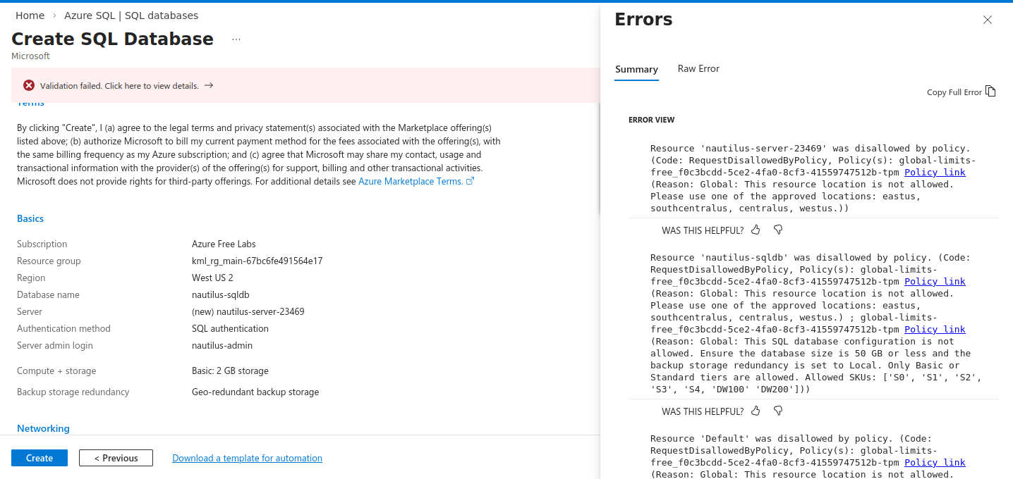 I wondering if this is specific to East US. When I did the task I was assigned to West US, and it worked. It’s possible that @Delray is not observing one of the limitations to the database and server size – it must be basic, and use fairly limited storage. He should try this again, and see if he’s assigned to some region other than East US. But in general, this lab does work.