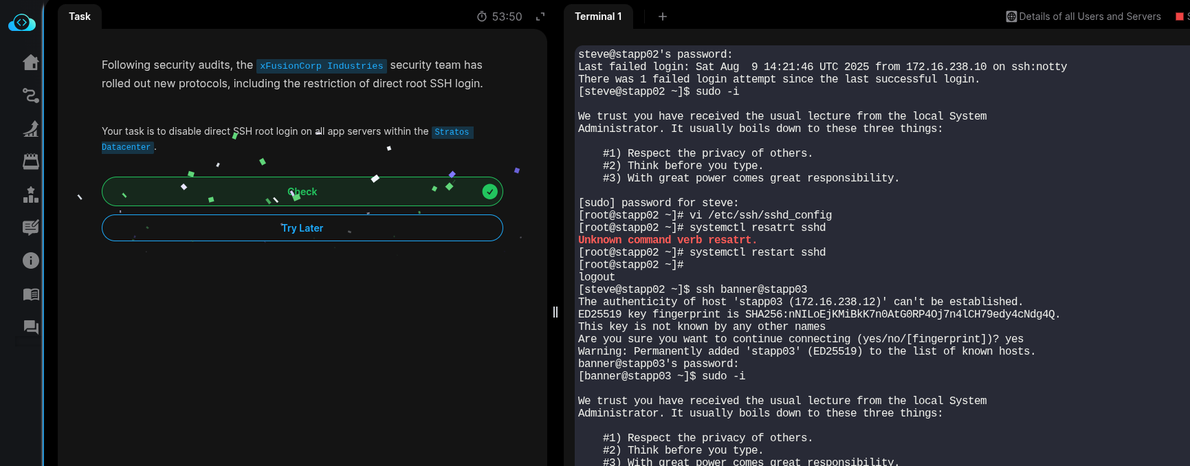 In this lab, I was asked to deny root login. The task was to edit the sshd_config file, set PermitRootLogin no, and then restart the sshd service.