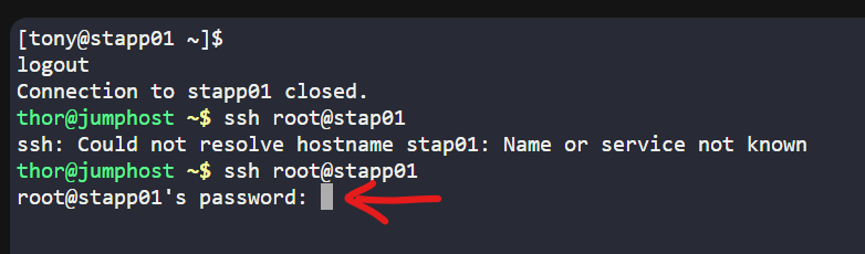 problem is santosh , i wanted to apply it to one server and need to confirm that the configuration is applied to that server properly , lets assume if i disable the root loging in ‘stapp01’ after i logged from jump server , password for the root should not be prompted right ?