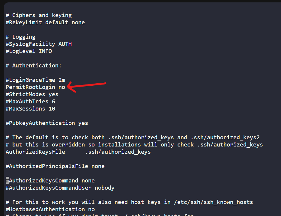 This is confusing, because if PermitRootLogin no was applied, it shouldn’t even ask for a password — it should just deny the connection immediately. I can’t figure out why this setting isn’t taking effect.