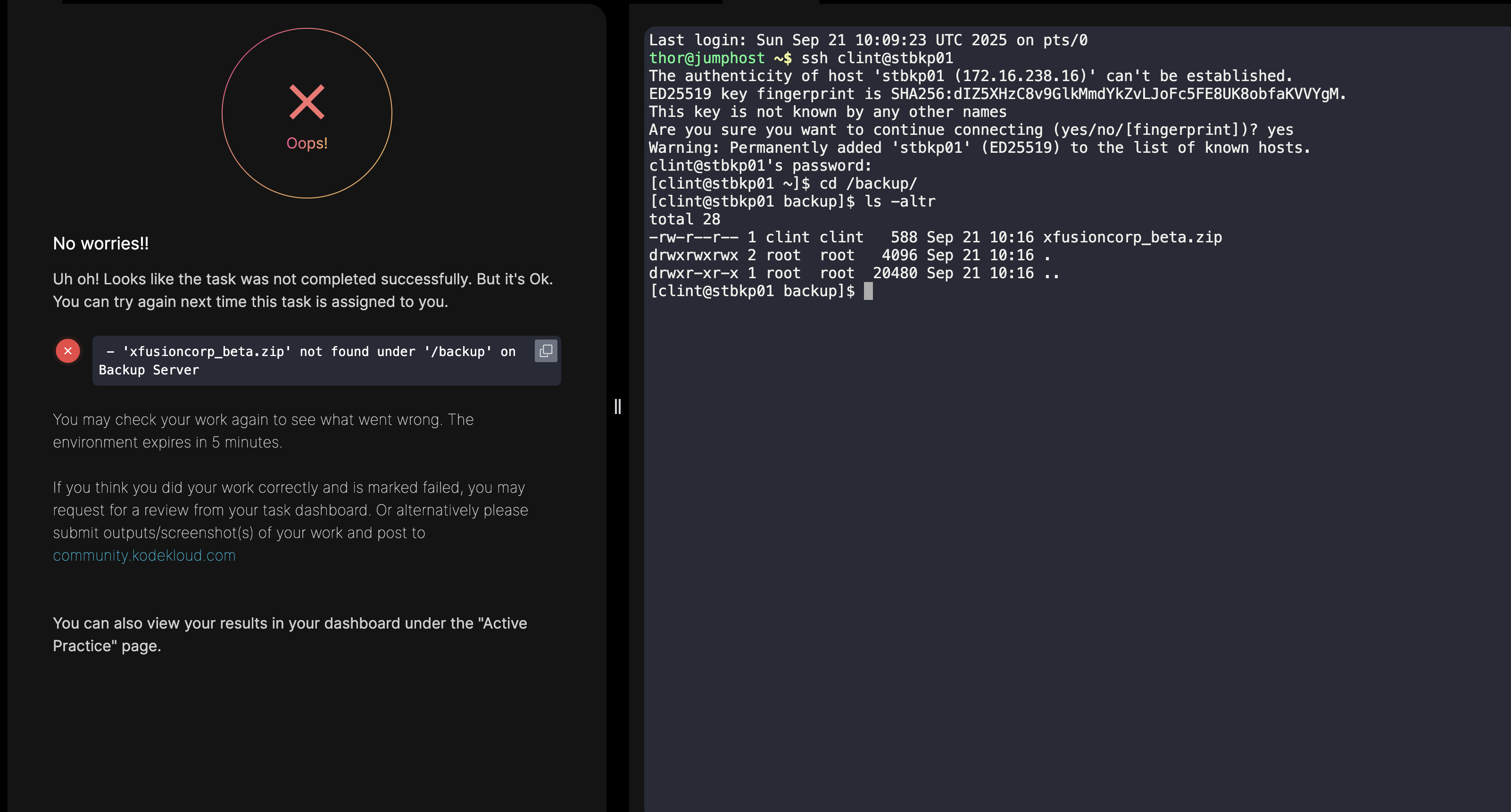 I was doing this task, i am getting this error, however, i can see the zip file on the backup_server at /backup location as you can see it in the screenshot.