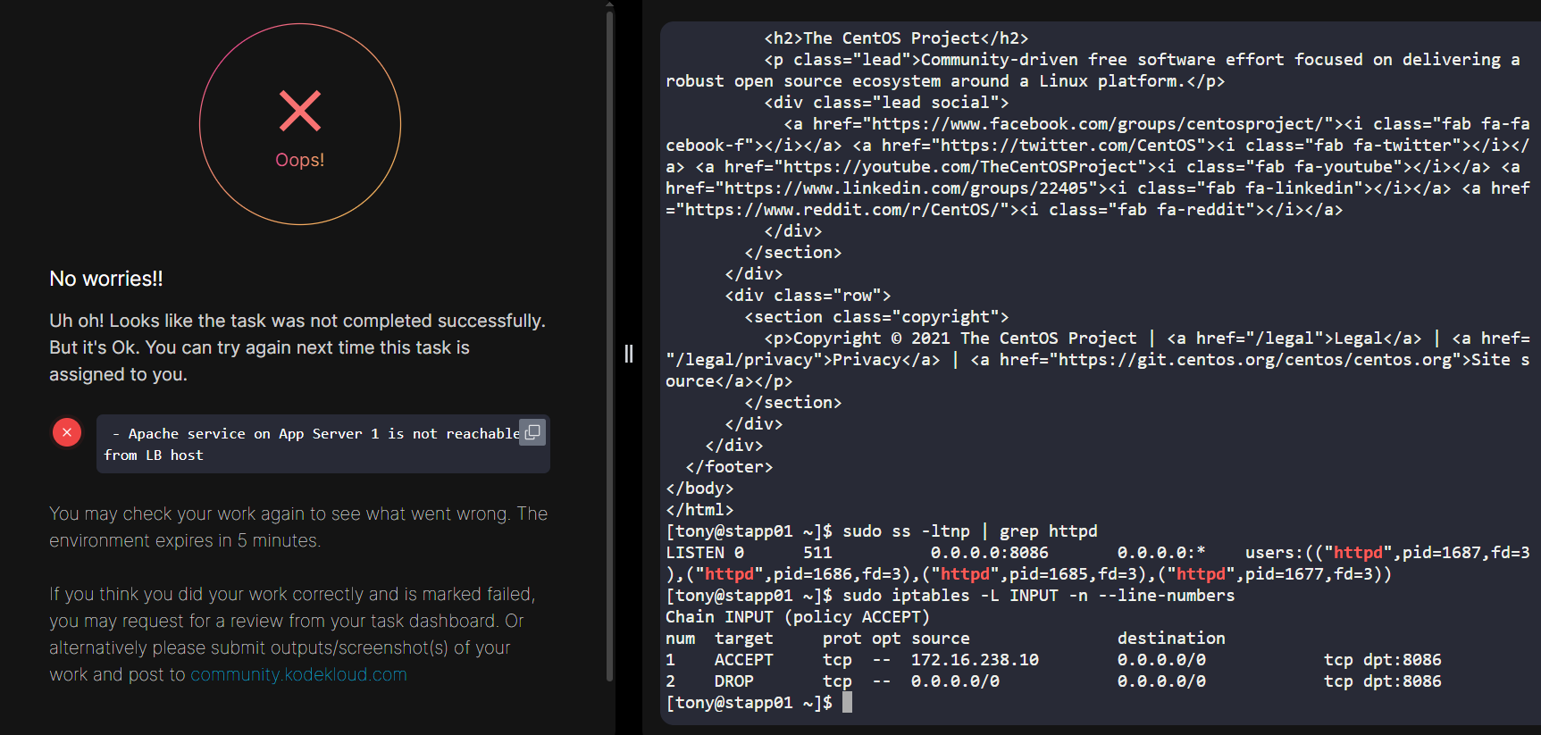 The task has been successfully completed, but the validation part failed with a message " Apache service on App Server 1 is not reachable from LB host"