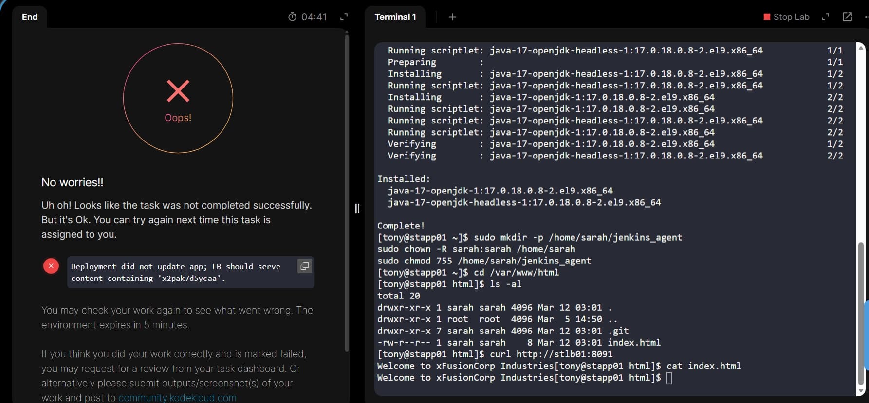 The checker is expecting a random string every retry — that’s the problem. First time ‘x2pak7d5ycaa’, then different ones each time. But the task just wants “Welcome to xFusionCorp Industries” on the load balancer, and it is showing exactly that.