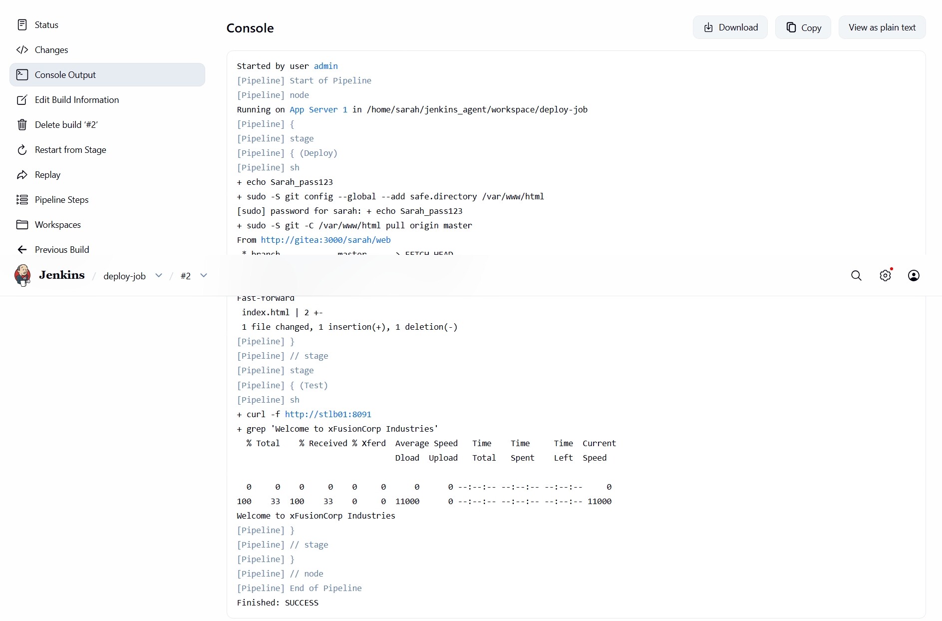 If the validator changes the Gitea repo to a random string, and your Test stage is hardcoded to look for “Welcome to xFusionCorp Industries”, the grep command will fail every time.