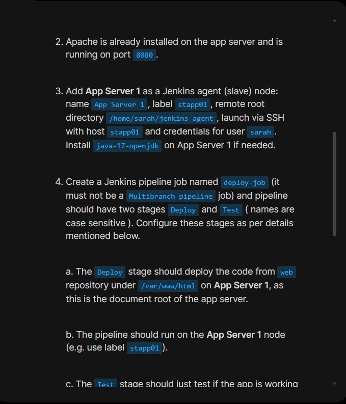 Add App Server 1 as a Jenkins agent (slave) node: name App Server 1 , label stapp01 , remote root directory /home/sarah/jenkins_agent , launch via SSH with host stapp01 and credentials for user sarah . Install java-17-openjdk on App Server 1 if needed.