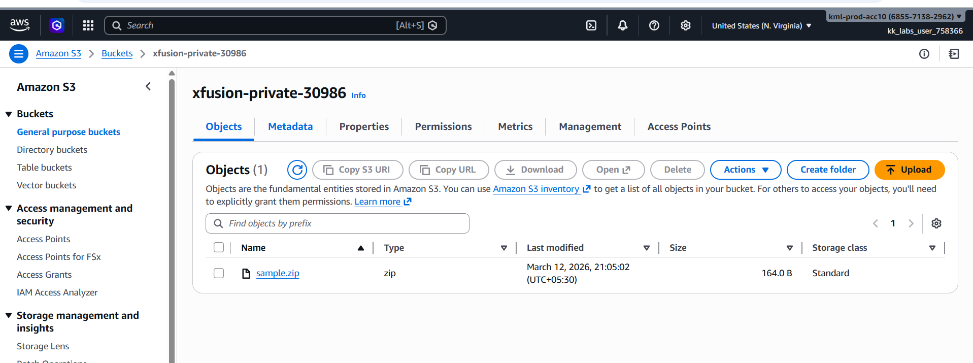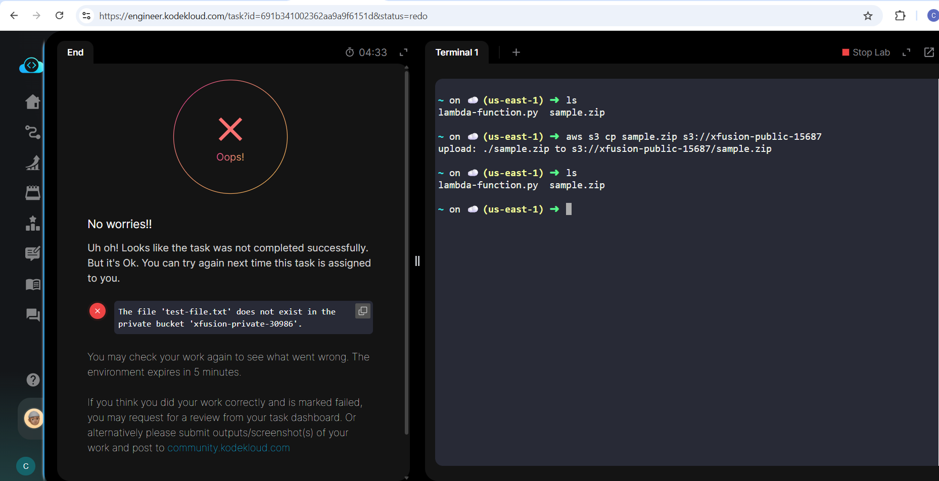 I could see sample.zip file added but im facing the issue that test-file.txt doesnot exist in the private S3 bucket( xfusion-private-30986)