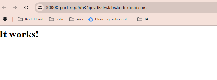 The webserver pod is running with Apache correctly listening on port 80 The webserver-service is set up as a NodePort targeting port 80