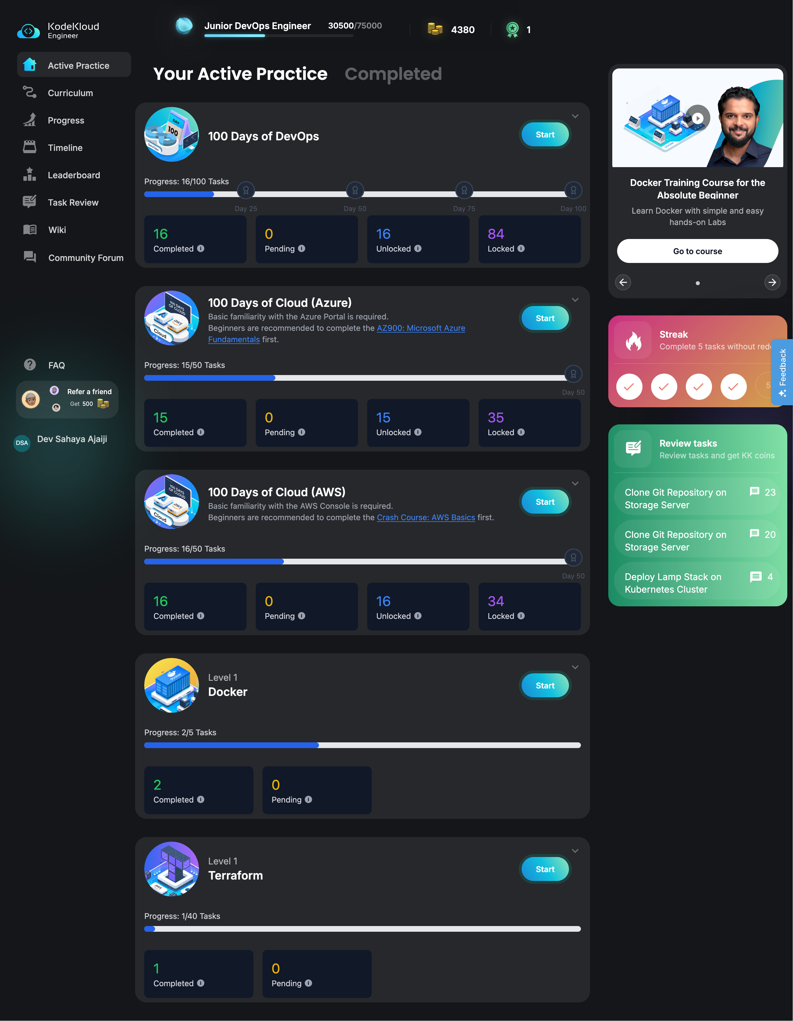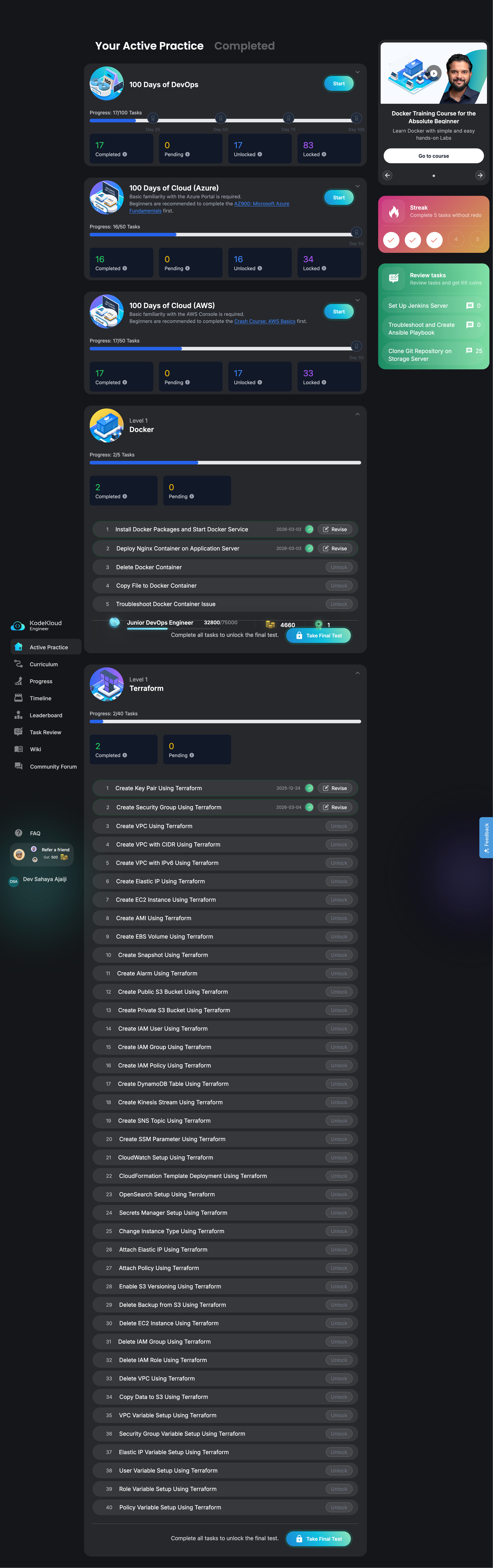 in the 5 active practice i can do only 4 . i did terraform first and 100 days of devops , aws and azure today and couldn’t do docker
