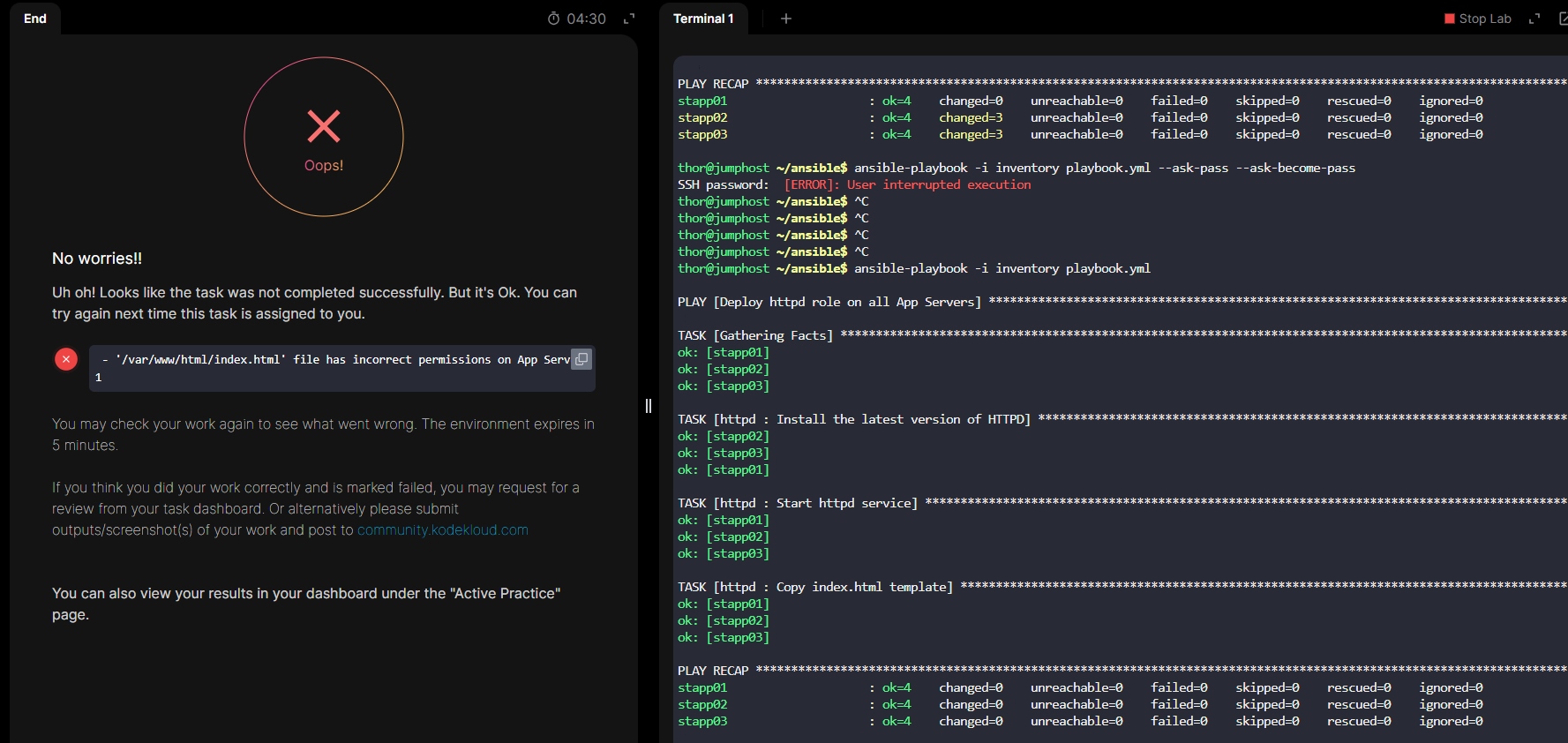 I got a similar error to you – what did you put in main.yaml? Looks like you’re not setting the ownership of index.html as the grader wants.