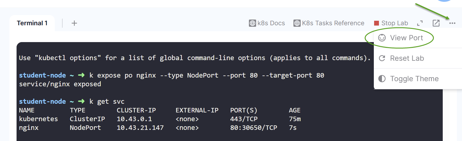 Normally on a single node playground, you can access NodePort services via the View Port option: