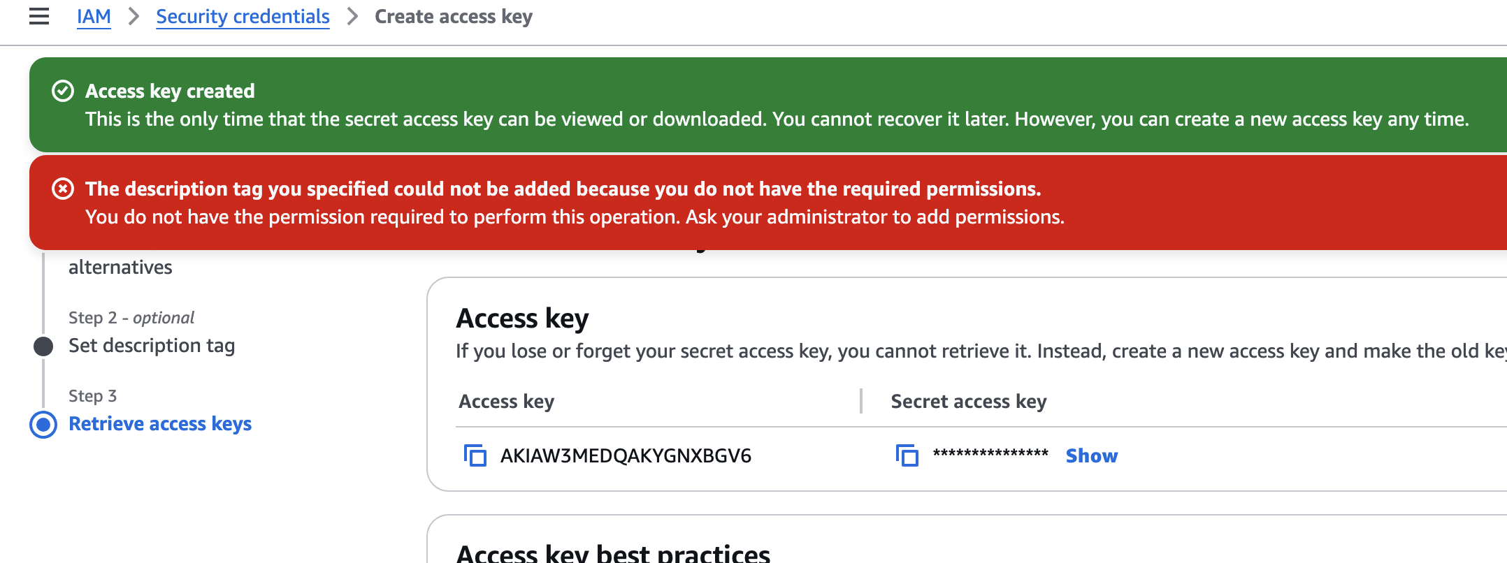 AWS access key and secret access not generating in aws plaground , getting error with permission denied.