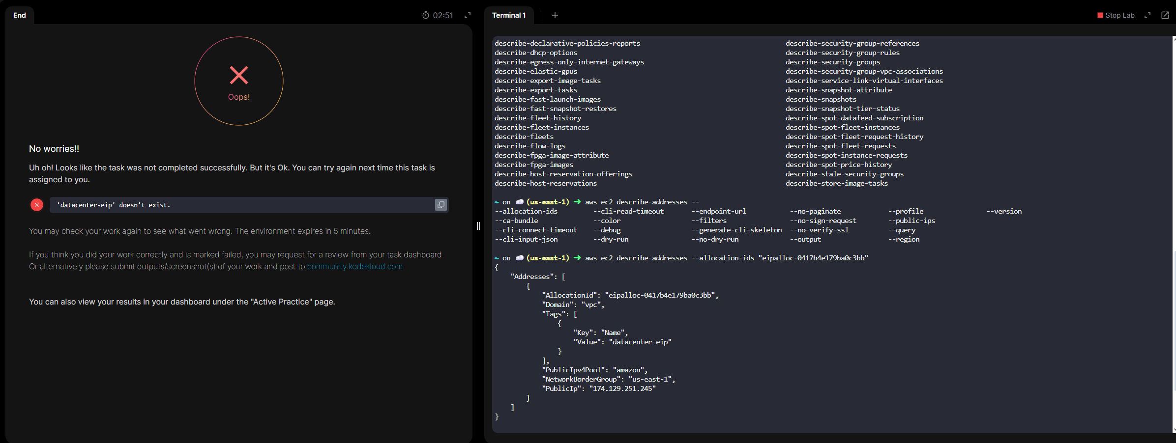 Hi, I was working on the 100 Days of Cloud (AWS). The task was to allocate an Elastic IP with name “datacenter-eip”.