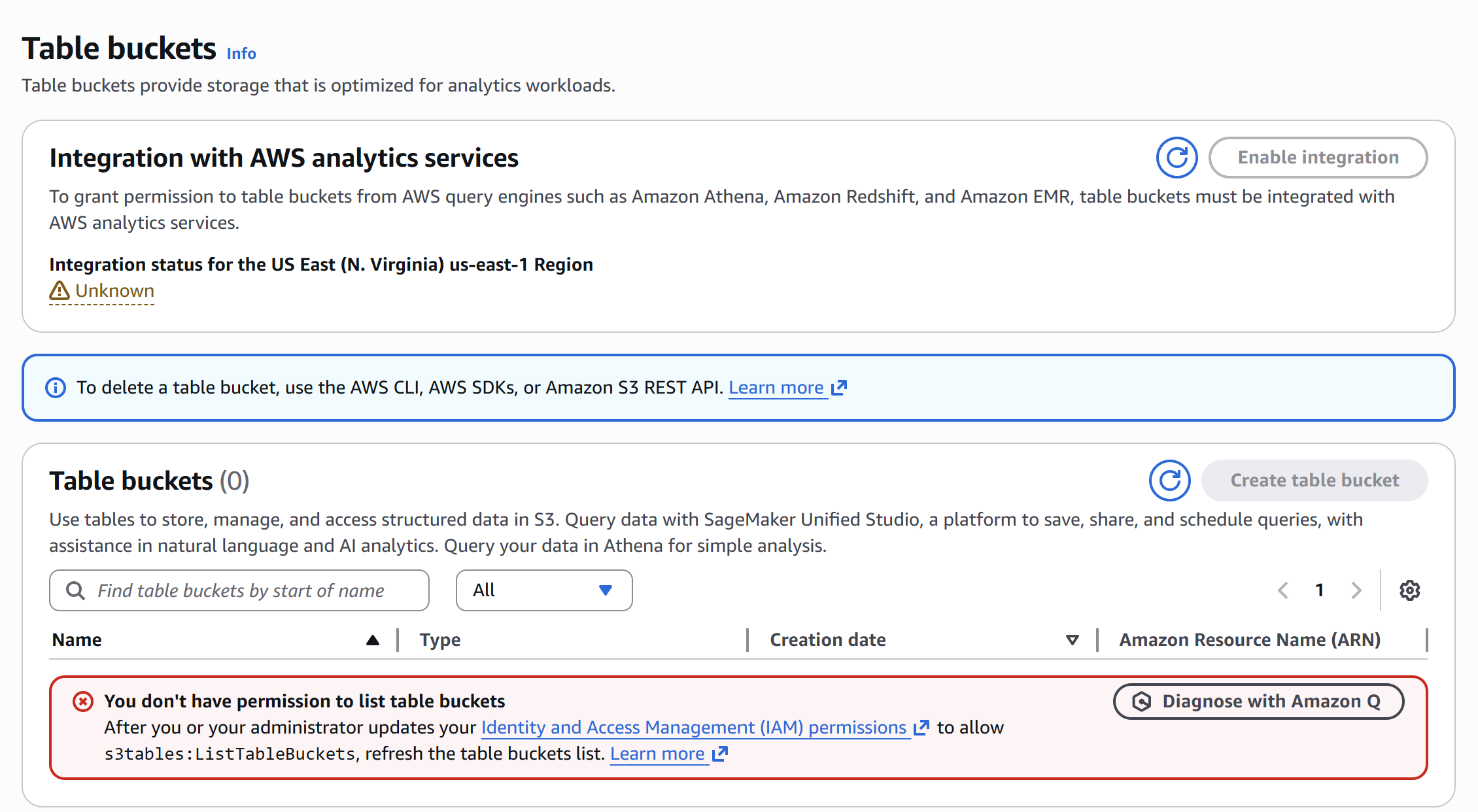 In AWS GLUE - to create a catalog we need S3 tables bucket URN only not general purpose S3 bucket. After logging into the AWS playground with the given credentials there was no option to create the S3 tables bucket and it is showing the IAM user is not having adequate permissions.
