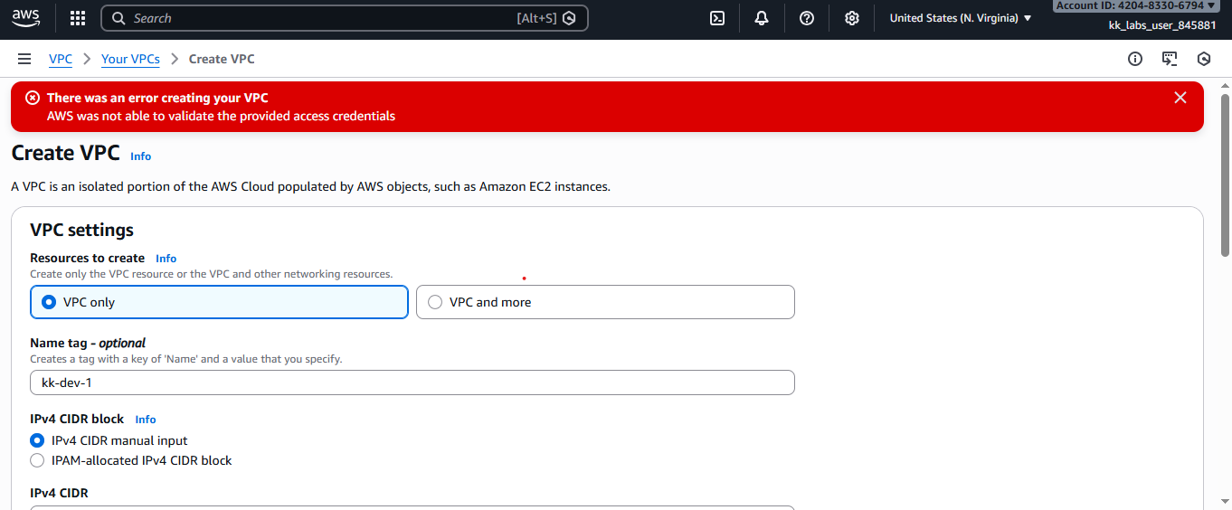 Because of this issue, I am unable to create networking resources (VPC) and cannot complete the lab.