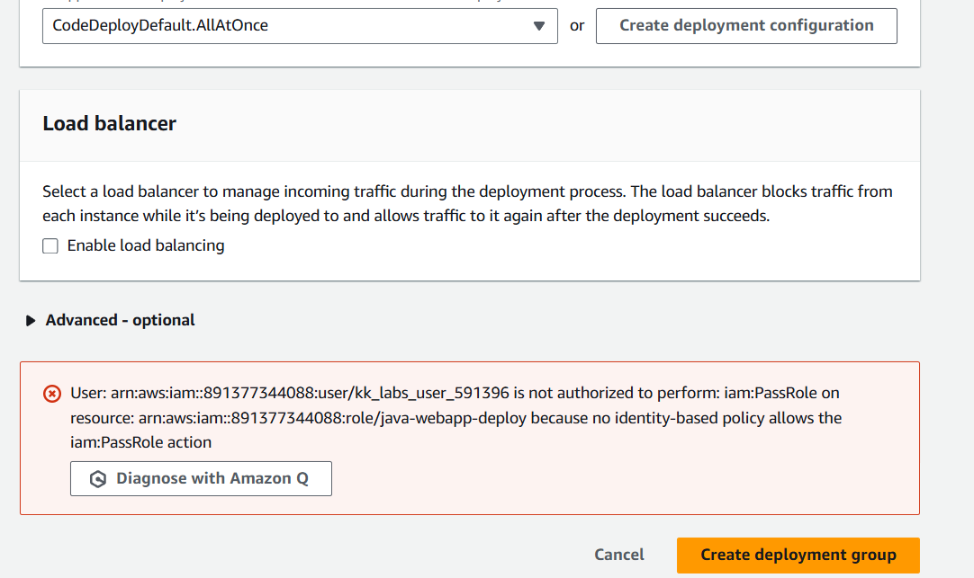 I am trying to create a CodeDeploy deployment group, but I am encountering an error related to iam:PassRole, which prevents me from creating any deployments.