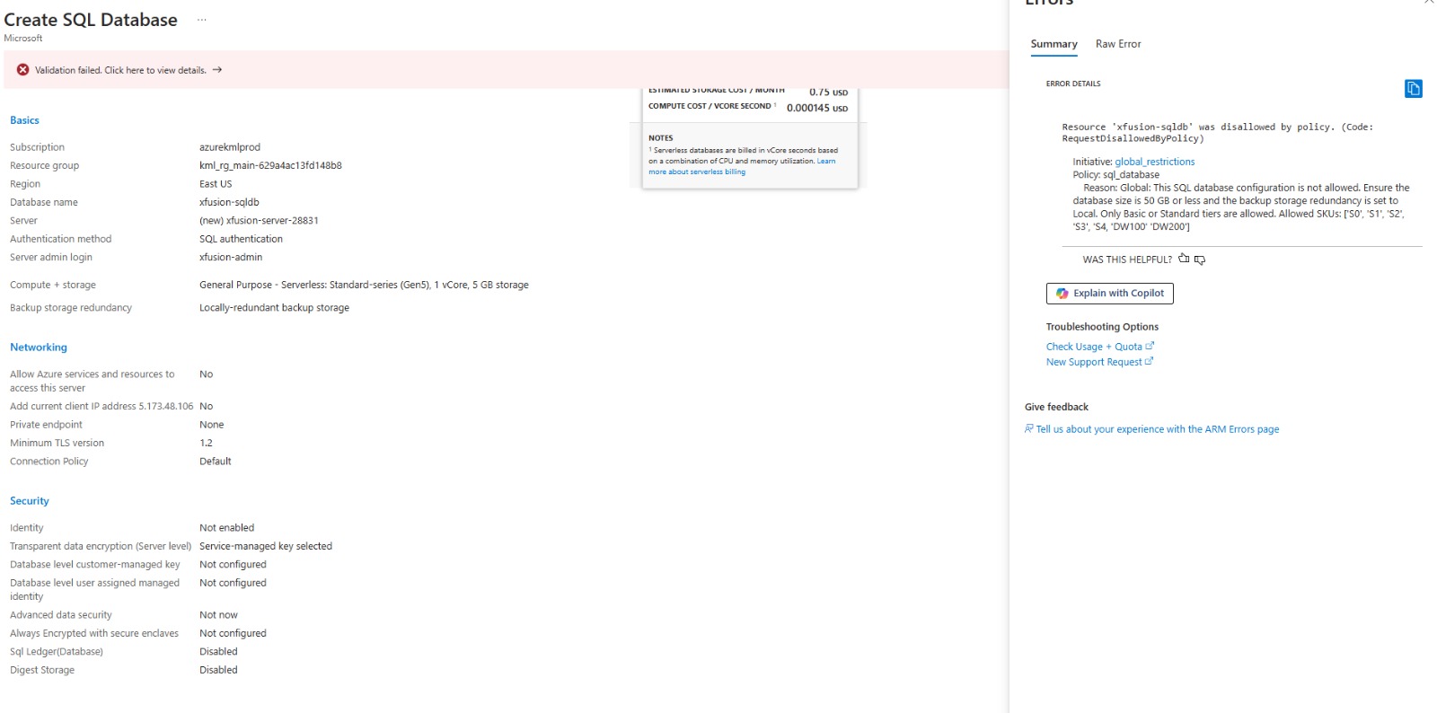 While attempting the Azure cloud level 1 task (Create an SQL database) after attempting the questions with the parameters provided unfortunately, I am unable to create the database due to an Azure policy restriction even though I never went beyond the given parameters or specifications.