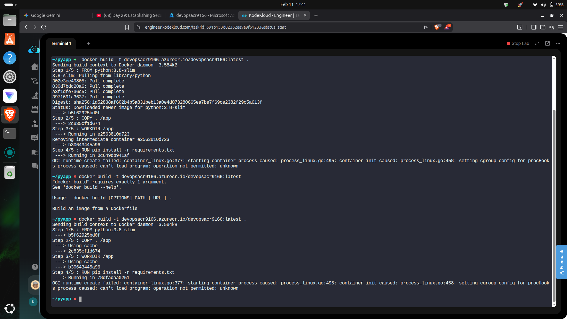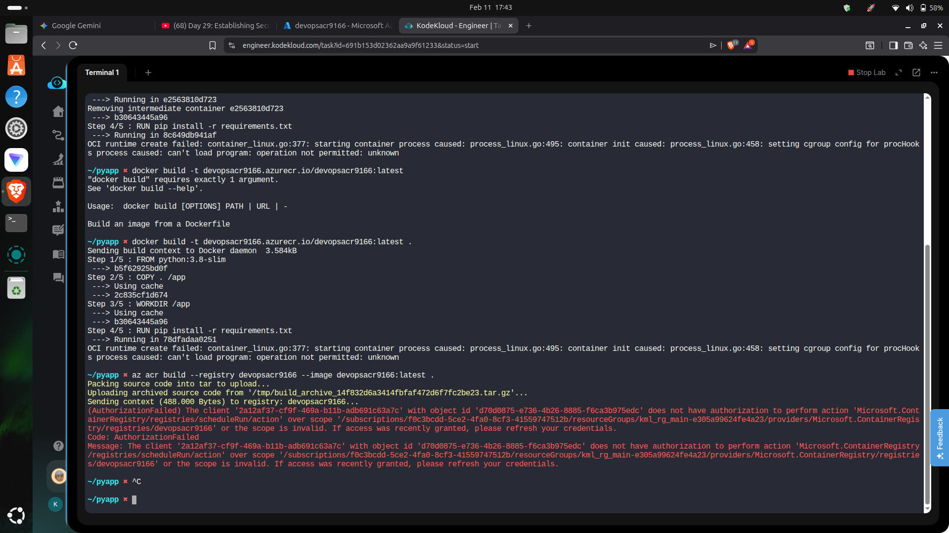 - az acr build fails (Account Permission Issue) When I try the Azure-native workaround (az acr build) to bypass the local Docker issue, I receive an Authorization error: