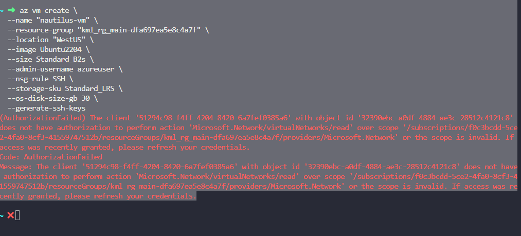 I am facing the below issue while trying to create azure vm command in the kode kloud engineer lab