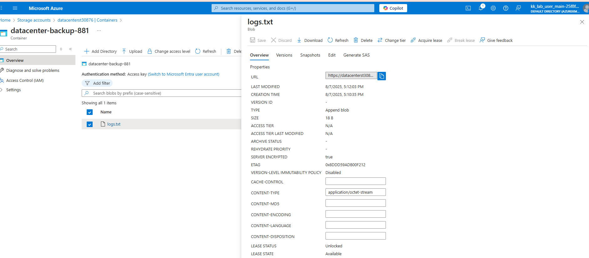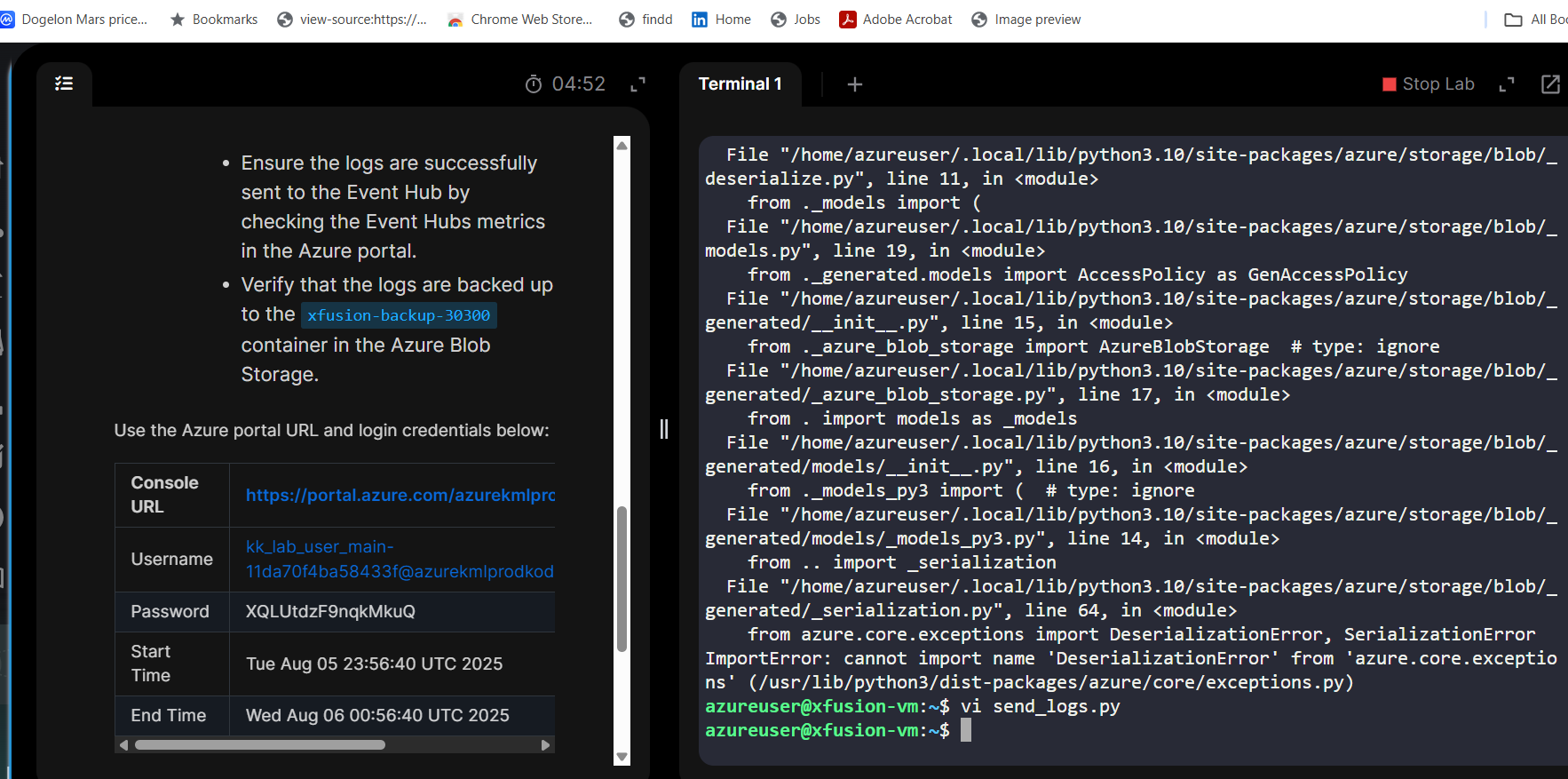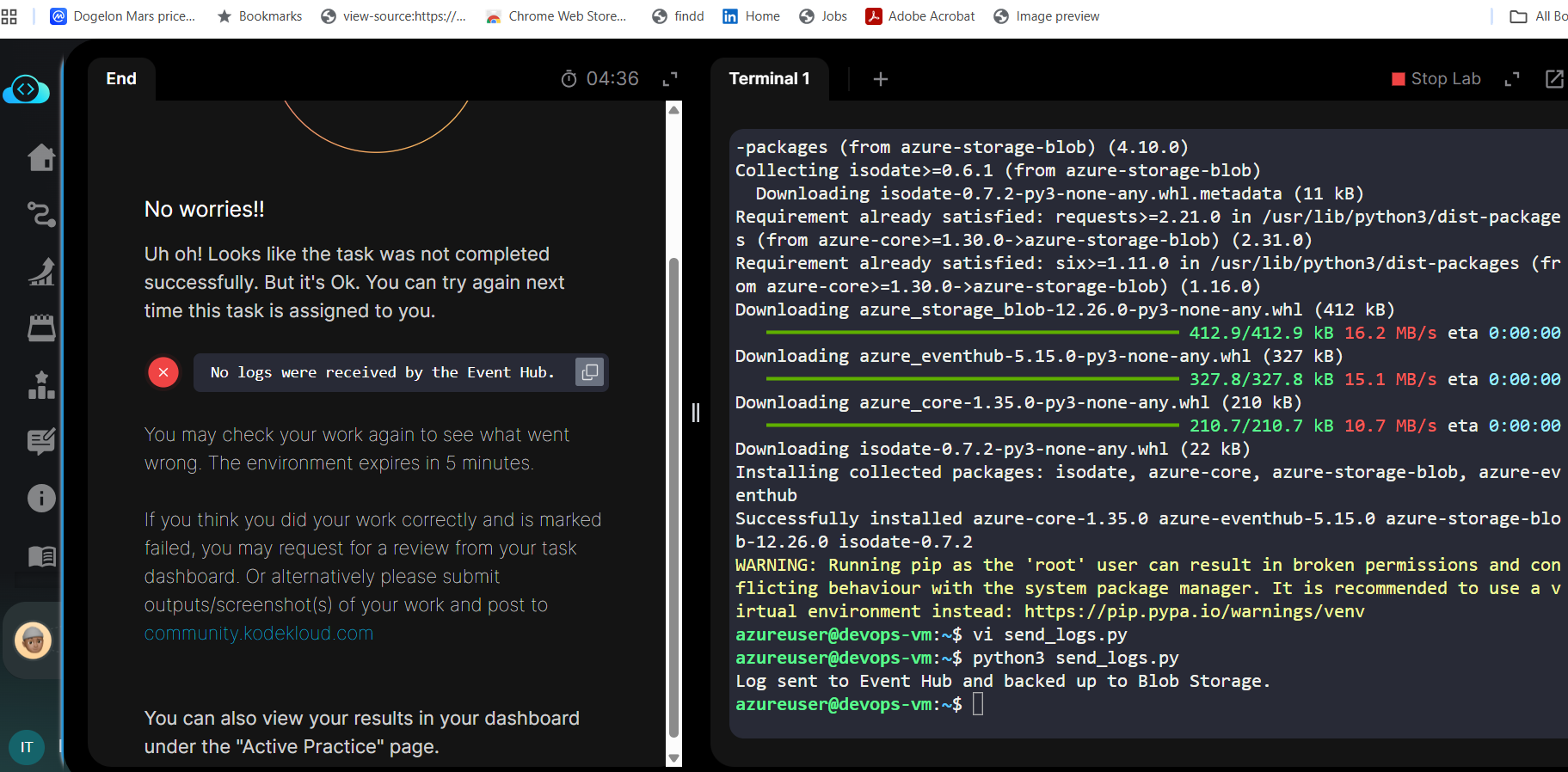 The script ran successfully and the logs were sent to the event hub and the storage container